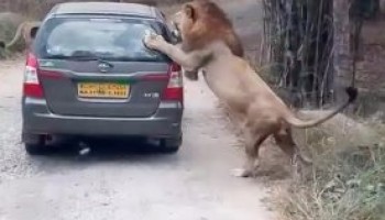 فيديو.. لحظة هجوم أسد على سيارة سفاري